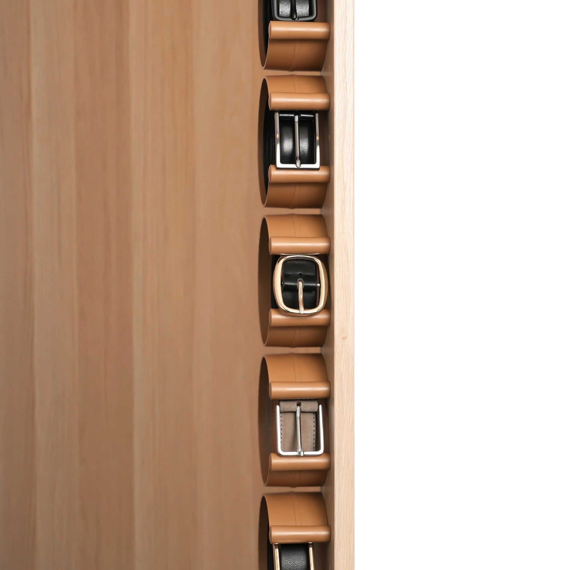 ease-c® is simply screwed into the existing holes (32 mm system with 5 mm holes) in your wardrobe – no drilling or gluing required. Belts are simply rolled up and inserted – that's it.