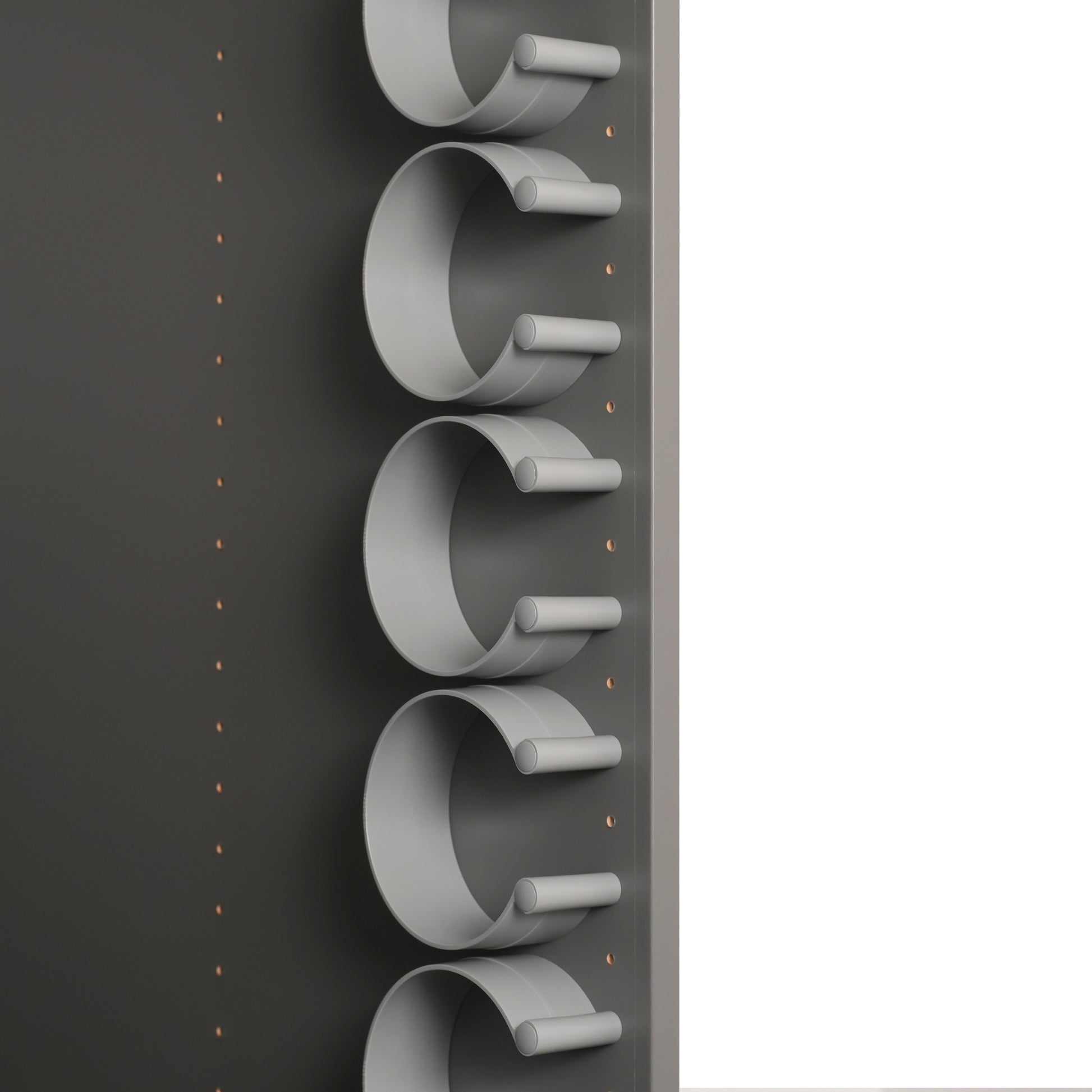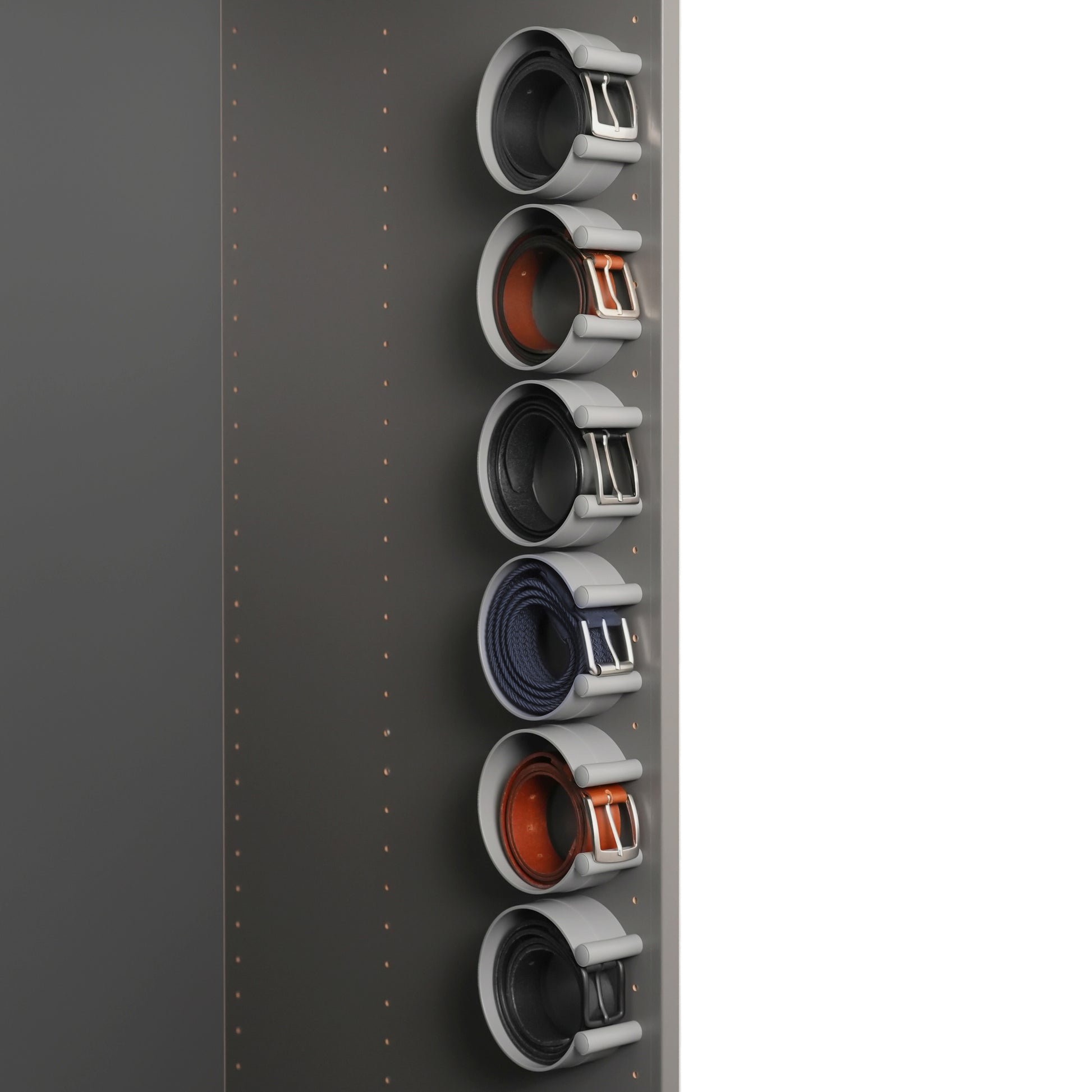 ease-c® wird einfach in die vorhandenen Lochreihen (32 mm-System mit 5 mm Löchern) deines Kleiderschranks geschraubt – ganz ohne Bohren oder Kleben. Gürtel werden aufgerollt eingelegt – fertig.